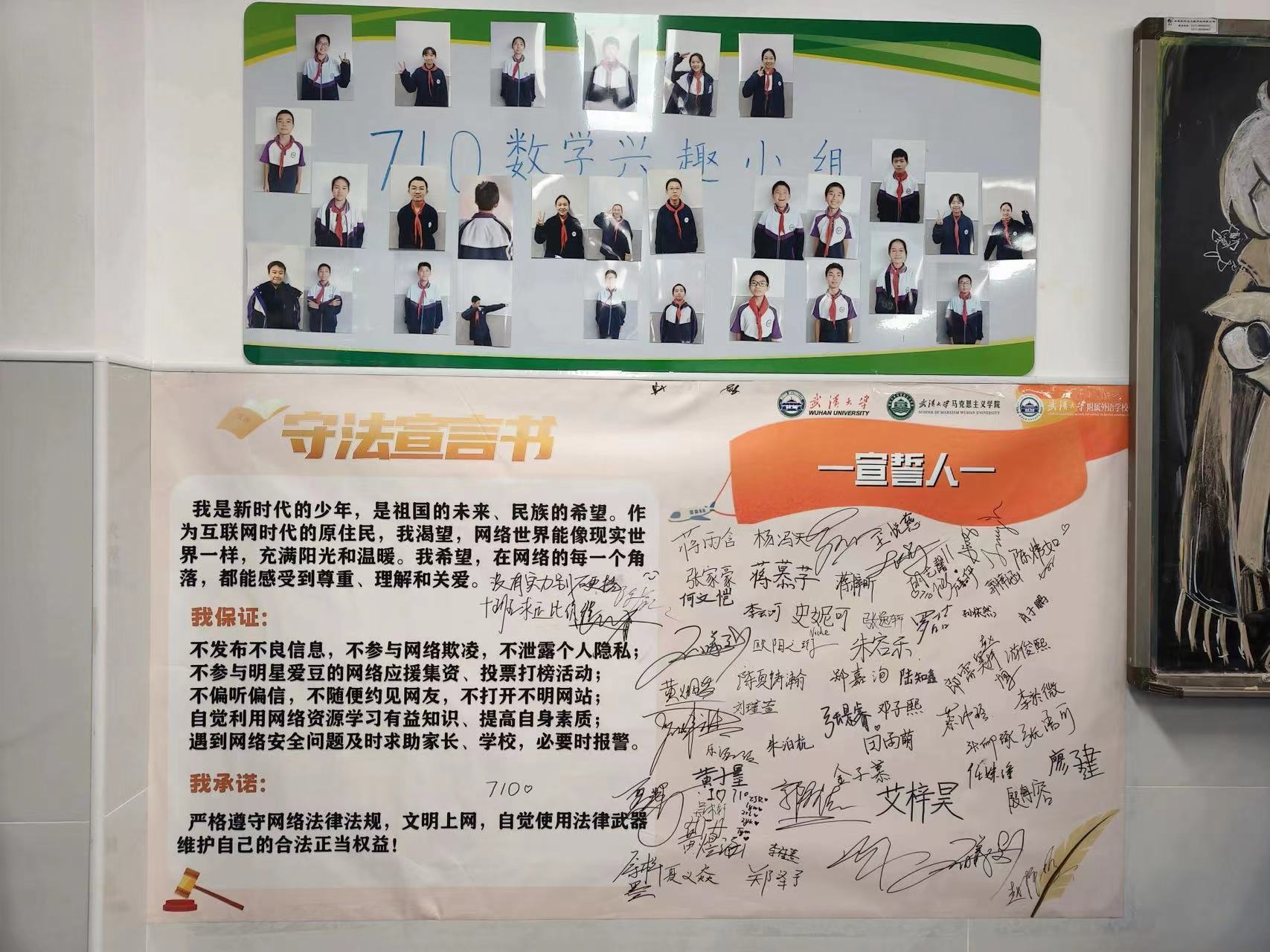 活动的第二环节由七年级10班蒋慕芓同学带领大家共同宣读由研究生同学起草的网络行为“守法宣言书”,共同承诺不参与网络欺凌和明星爱豆的网络应援集资、投票打榜活动,严格遵守网络法律法规,自觉使用法律武器维护自己的合法正当权益。
