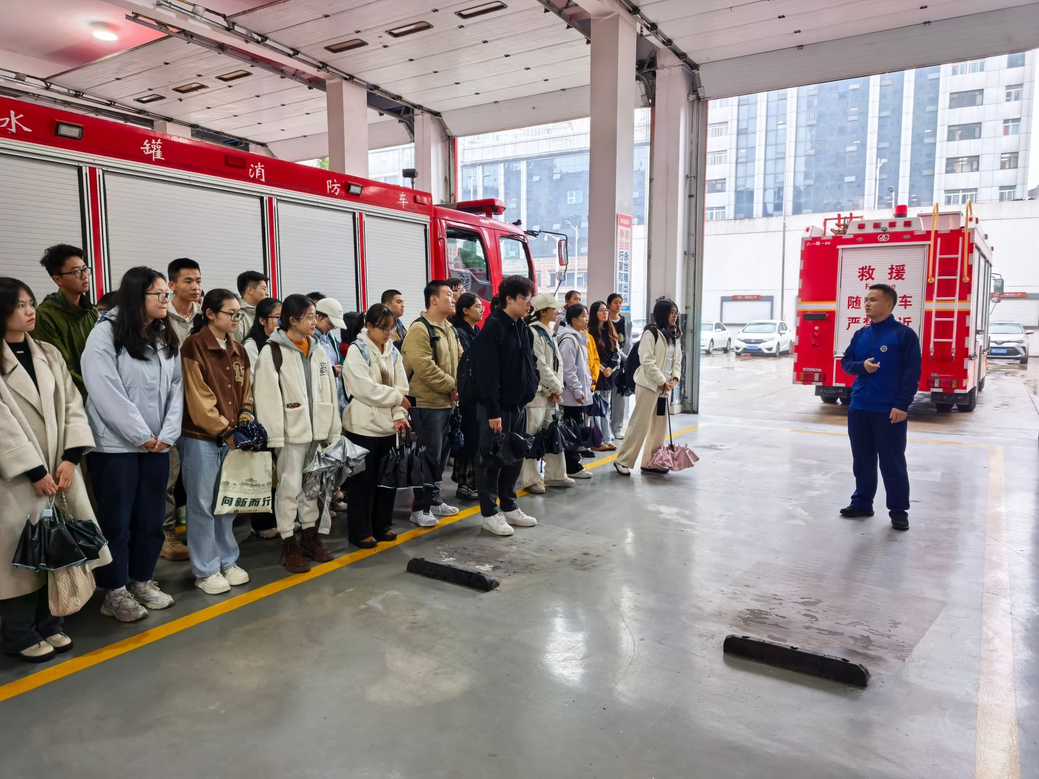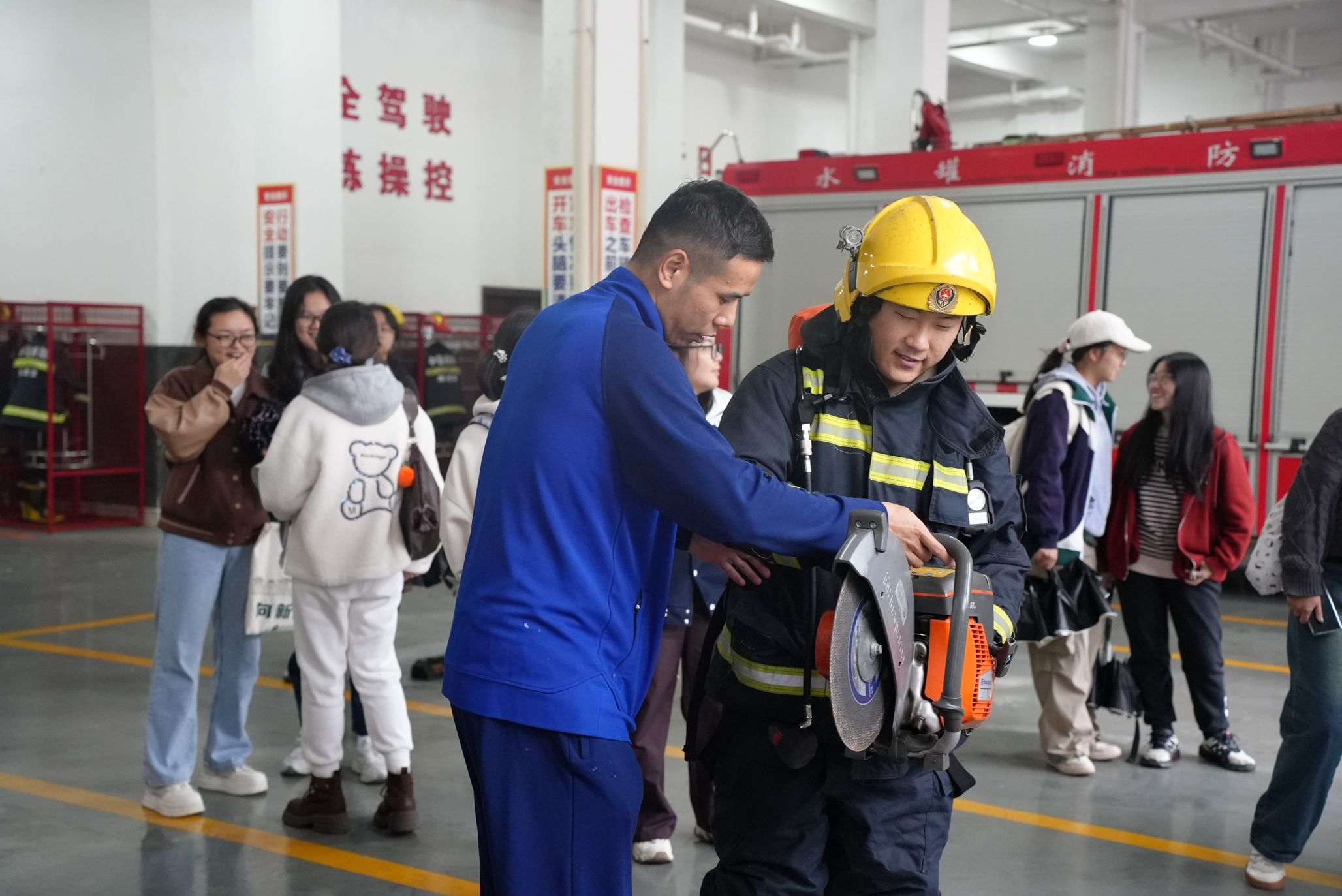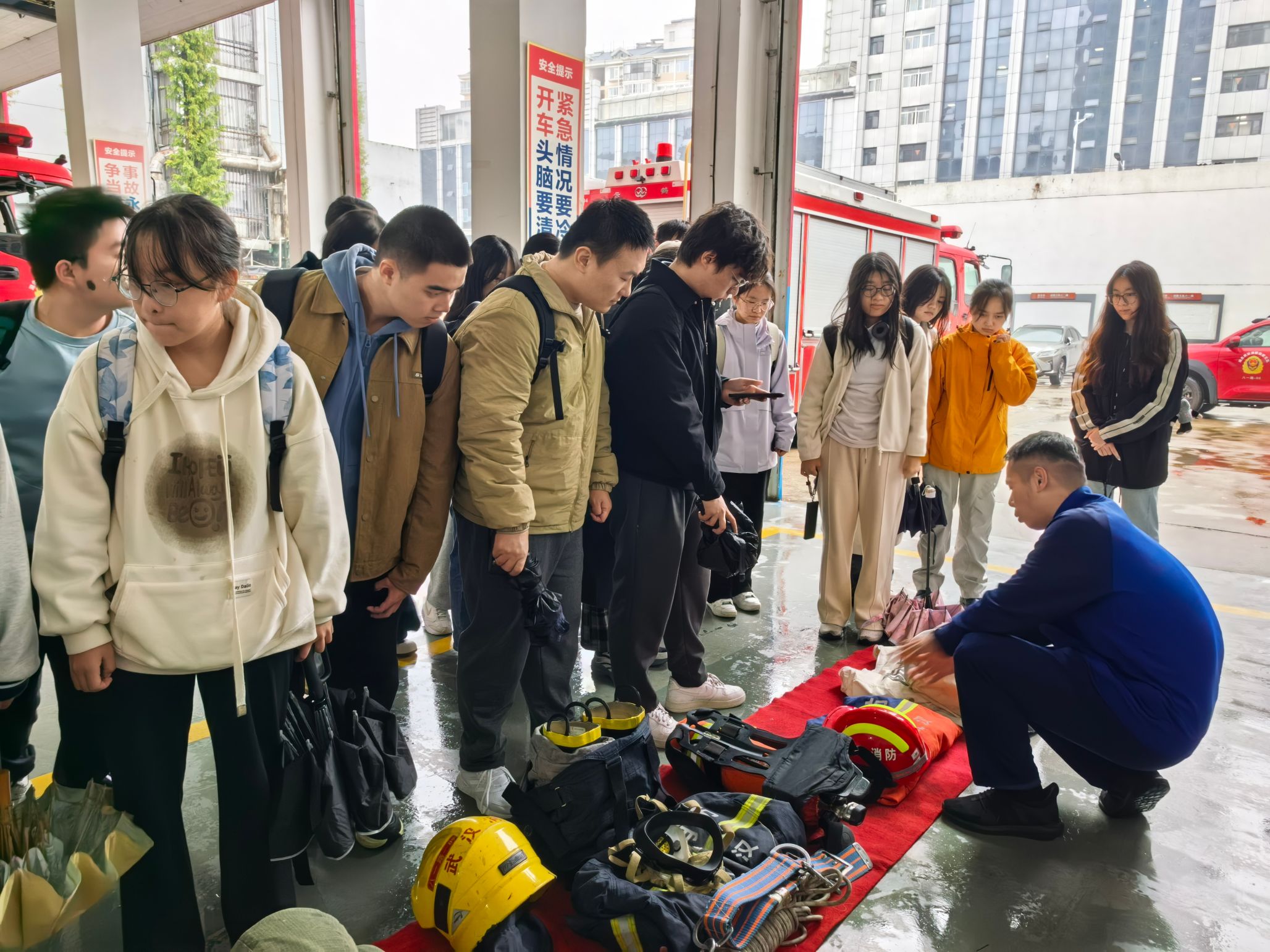 随后,师生们来到消防车辆停放区。指导员详细介绍了不同功能消防车的装备配置与应用场景,包括水罐消防车、抢险救援车等,并结合实际案例讲解了消防救援流程与战术部署。师生们认真聆听,不时提问,对消防工作的专业性与复杂性有了更深刻的认识。