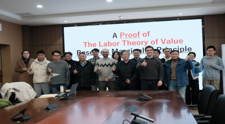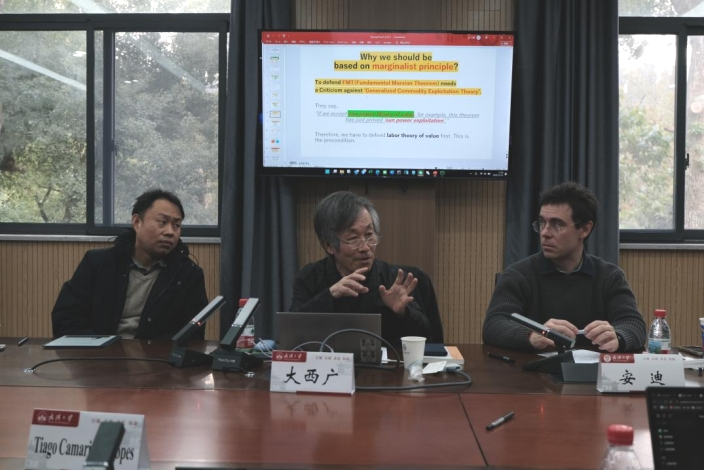 12月15日上午,日本京都大学和庆应义塾大学名誉教授、世界政治经济学会副会长大西广(Hiroshi Onishi),作了题为《基于边际主义原则的劳动价值论证明》的学术讲座。大西广教授介绍了日本数理马克思主义政治经济学的发展状况,解读了“马克思主义基本定理”的核心内涵,通过数学方法证明了劳动价值论所依赖的劳动投入与产品数量之间的历史条件性比例关系,表明了边际主义原则无损于资本主义下的劳动价值论,并与现场师生进行了互动问答。