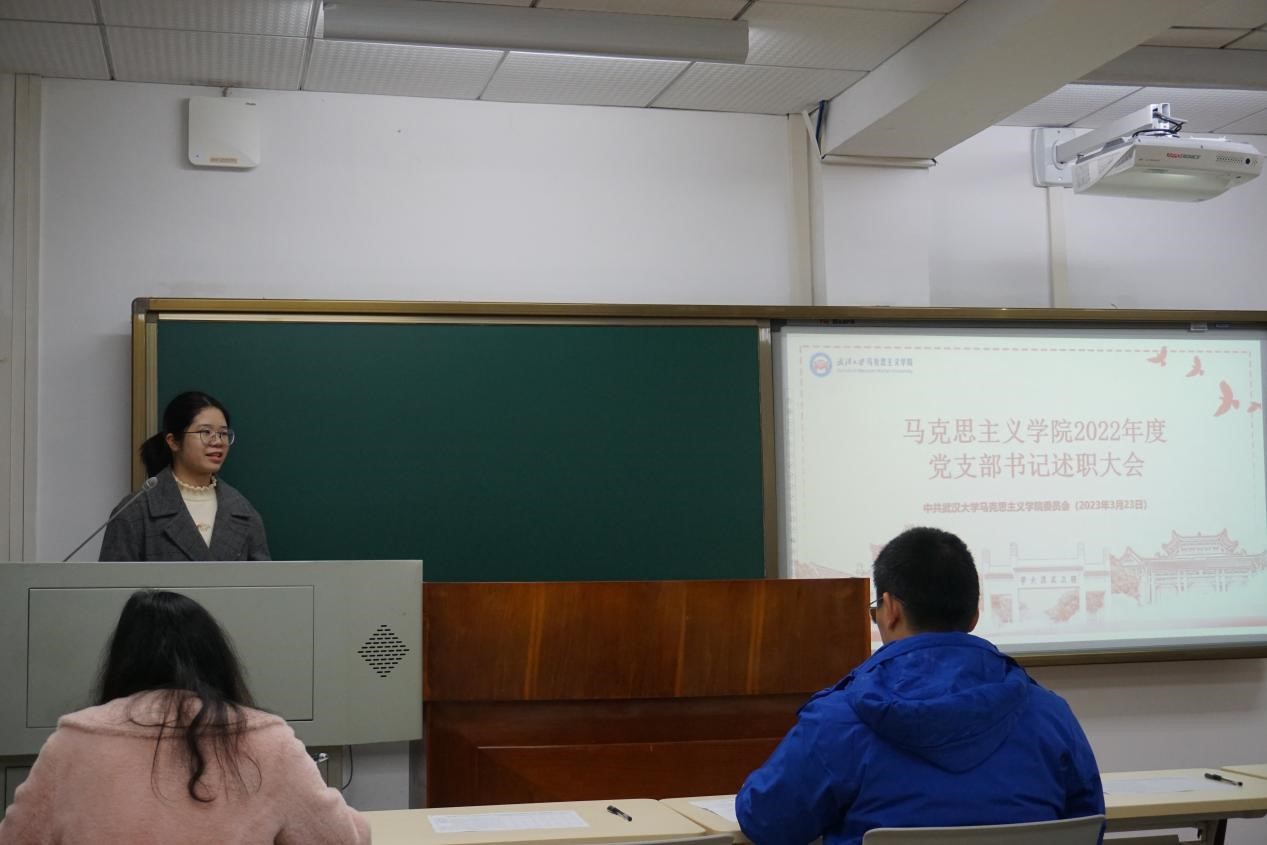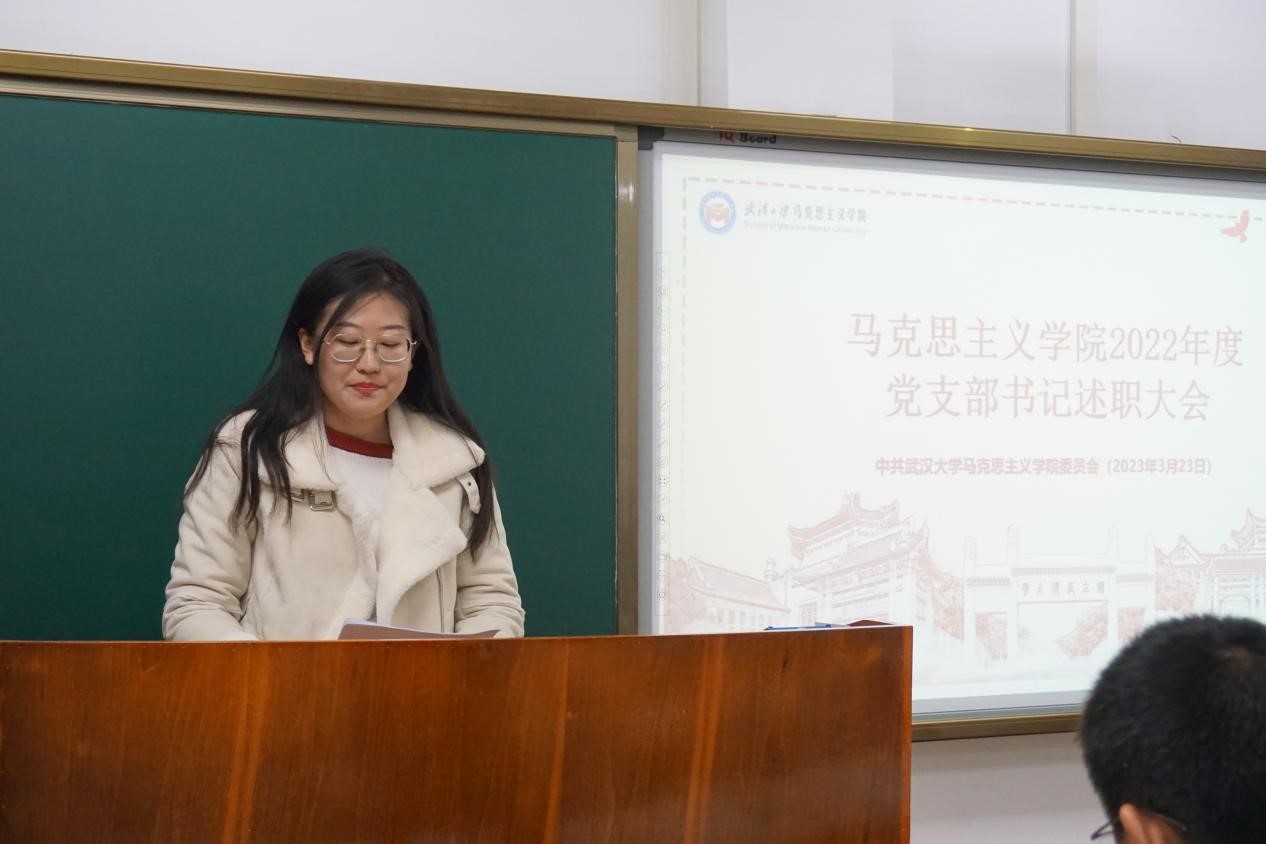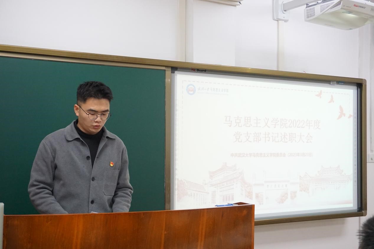 2022级博士研究生第二党支部书记杨檬从思想政治理论建设、支委负责制互助关系网建立、发挥马理论学科优势、积极开展党日活动等方面进行述职。在支部成员的共同努力之下,支部作为样板党支部,代表学院首发录制成人直播