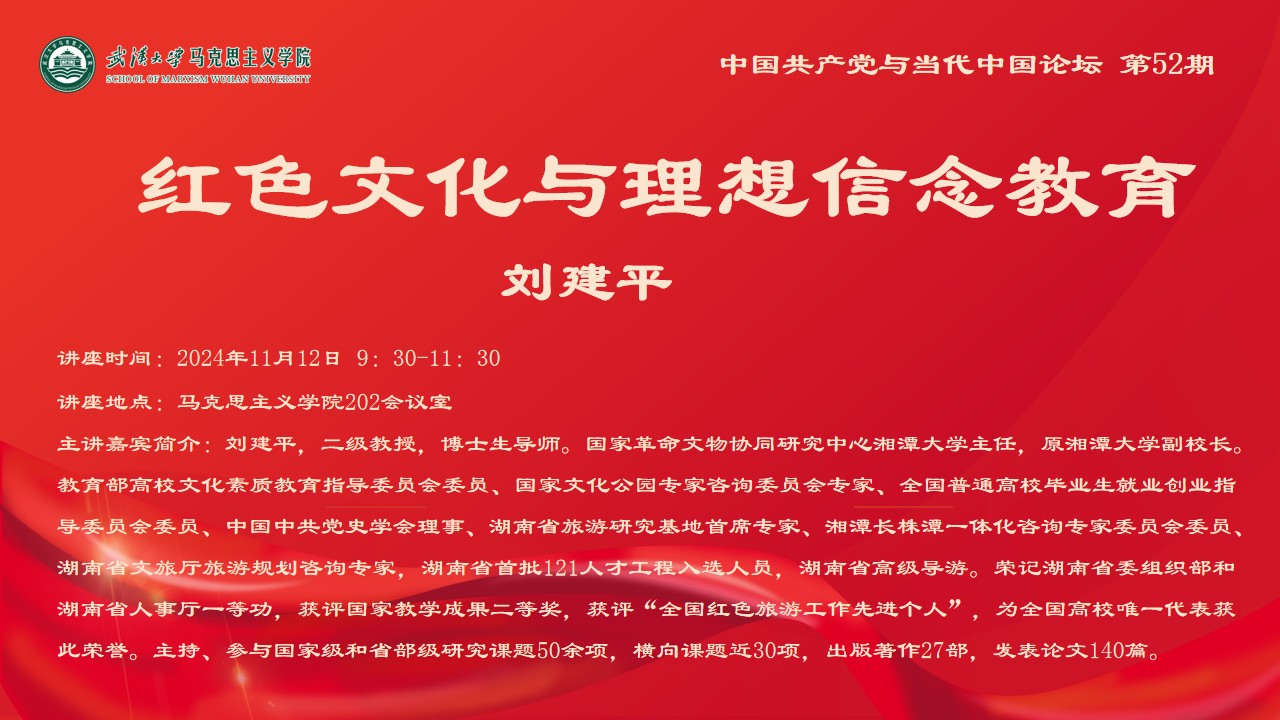 主讲嘉宾简介:刘建平,二级教授,博士生导师。国家革命文物协同研究中心湘潭大学主任,原湘潭大学副校长。教育部高校文化素质教育指导委员会委员、国家文化公园专家咨询委员会专家、全国普通高校毕业生就业创业指导委员会委员、中国中共党史学会理事、湖南省旅游研究基地首席专家、湘潭长株潭一体化咨询专家委员会委员、湖南省文旅厅旅游规划咨询专家,湖南省首批121人才工程入选人员,湖南省高级导游。荣记湖南省委组织部和湖南省人事厅一等功,获评国家教学成果二等奖,获评“全国红色旅游工作先进个人”,为全国高校唯一代表获此荣誉。主持、参与国家级和省部级研究课题50余项,横向课题近30项,出版著作27部,发表论文140篇。