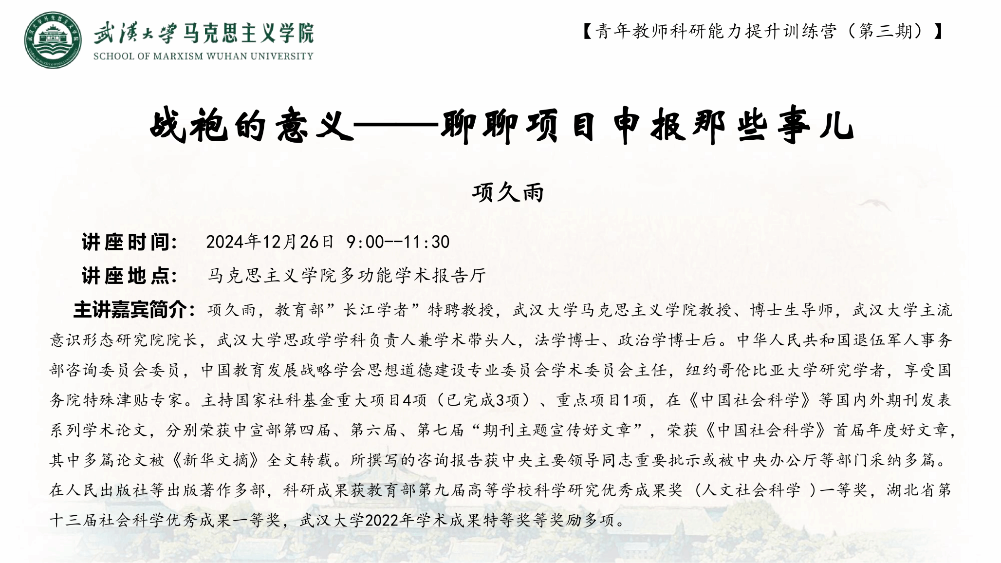 项久雨,教育部”长江学者”特聘教授,成人直播 教授、博士生导师,成人直播 主流意识形态研究院院长,成人直播 思政学学科负责人兼学术带头人,法学博士、政治学博士后。中华人民共和国退伍军人事务部咨询委员会委员,中国教育发展战略学会思想道德建设专业委员会学术委员会主任,纽约哥伦比亚大学研究学者,享受国务院特殊津贴专家。主持国家社科基金重大项目4项(已完成3项)、重点项目1项,在《中国社会科学》等国内外期刊发表系列学术论文,分别荣获中宣部第四届、第六届、第七届“期刊主题宣传好文章”,荣获《中国社会科学》首届年度好文章,其中多篇论文被《新华文摘》全文转载。所撰写的咨询报告获中央主要领导同志重要批示或被中央办公厅等部门采纳多篇。在人民出版社等出版著作多部,科研成果获教育部第九届高等学校科学研究优秀成果奖 (人文社会科学 )一等奖,湖北省第十三届社会科学优秀成果一等奖,成人直播 2022年学术成果特等奖等奖励多项。
